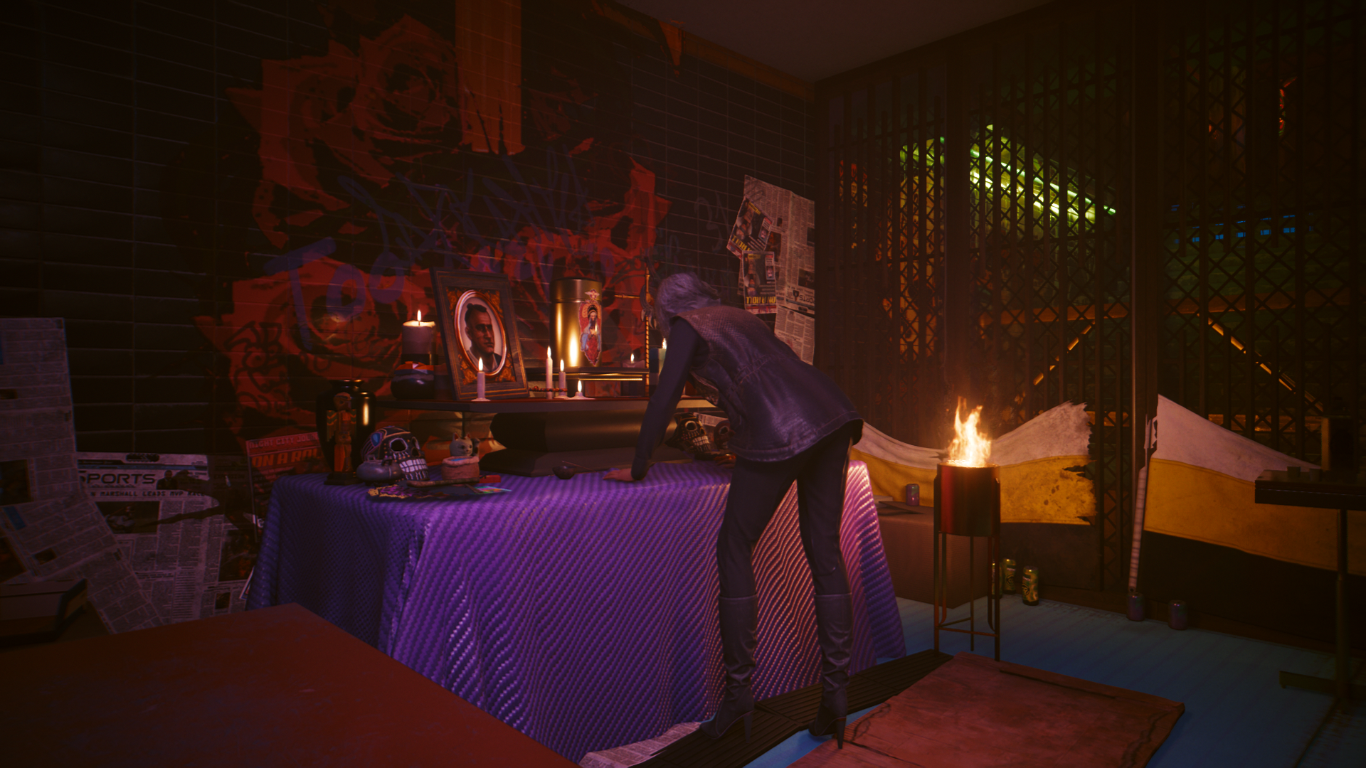 It was somewhere between chasing down a psyberpsycho in a parking garage and sneaking into club Empathy to upload a virus that the mission disappeared. The mission in question was attending Jackie Wellse’s ofrenda. For non-spanish speakers, this amounts to a wake or funeral service for family and friends. And Jackie was, again, my best friend.