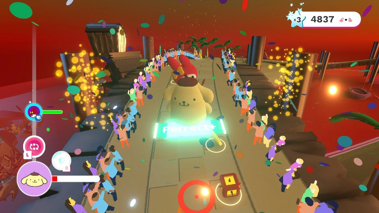 One design that really reinforces the joy of movement in the game is how the characters dance. At the start of a level Hello Kitty, Pom-Pom Purrin and My Melody (the opening available characters) step to the beat, their floofy bodies gently swaying with each step. For every well-timed step a meter in the upper right hand corner begins to fill. If a player is able to maintain their step and avoid obstacles the star meter will fill completely at which point Hello Kitty will begin to dance with more zest. Where before her head would simply bob, now her arms and legs will begin to move. If the player continues to successfully loop around the track eventually Hello Kitty will not just bob her head, she will literally hop and kick her legs out, wobble her head back, and seem to clap in the air with every step. Meanwhile behind her Pom-Pom Purrin who simply wobbled left and right will begin to pump his arms forward and twist his chonky body around while his ears bob. This success also comes with visual and audio clues such as more music, more enthusiasm from the crowd, and sometimes a quasi-lazer light show.