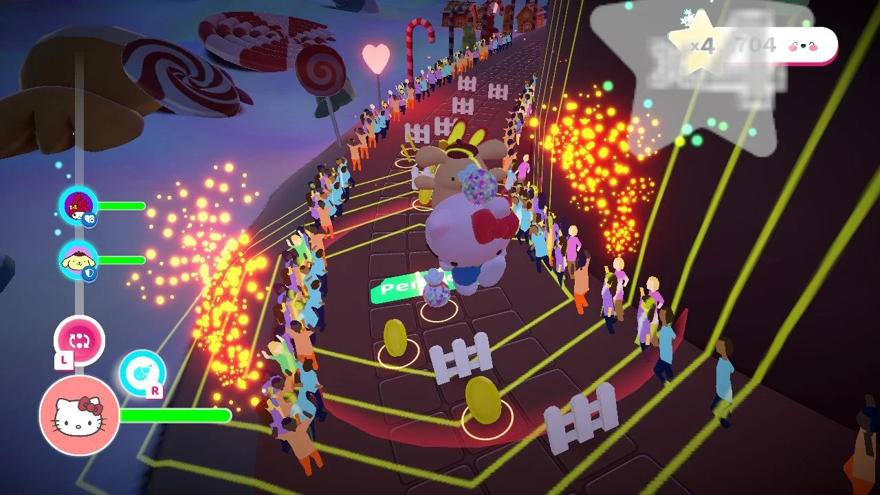 Any and all motion/rhythm video games are about maintaining the beat and flow state of whatever music or energy is being provided. Hello Kitty Happiness Parade understands how important that flow state is and builds its visual, auditory, and ludic energy around that principle. Even players who would never in their lives imagine themselves playing a Hello Kitty videogame (which would have been me four years ago) will be transfixed by the energy of this game because every detail is generating and perpetuating motion.