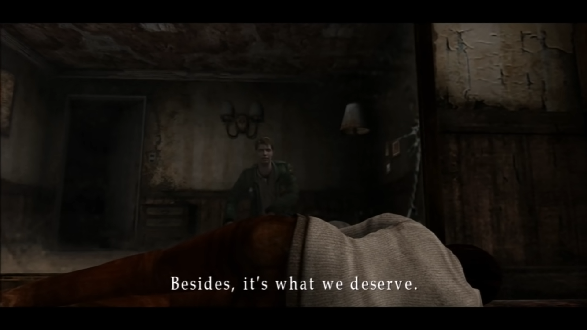 The lack of ability to talk to Angela, or influence James in any way however speaks to how cutscenes can work as an in-game mechanic for driving narrative goals. James is observing Angela’s struggle with her own guilt and suicidal thoughts, and while he offers her some kind of condolence to her, the distance between them reveals his own selfishness and how the player is steadily becoming aware of a general sense of helplessness.